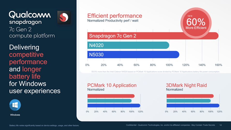 Snapdragon 7c Gen 2. to układ wykonany w procesie 8 nm. Jest zasadniczo tym samym SoC, co oryginalny Snapdragon 7c. Jedyną zmianą jest wyższe taktowanie zegara w rdzeniach Cortex-A76 z 2,4 GHz na 2,55 GHz. Inne aspekty, takie jak układ graficzny Adreno 618, procesor DSP Hexagon 692, modem Snapdragon X15 LTE i ISP Spectra 255 pozostają takie same. Dlatego też Snapdragon 7c Gen 2 prawdopodobnie będzie lepszą wersją oryginalnego 7c, a nie prawdziwą zmianą generacyjną. Według Qualcomm, Snapdragon 7c Gen 2 może zaoferować do 60% lepszą wydajność na wat w systemie Windows 10 w porównaniu z układami Gemini Lake Refresh, takimi jak Intel Celeron N4020 i, w dużym stopniu, Pentium Silver N5030.