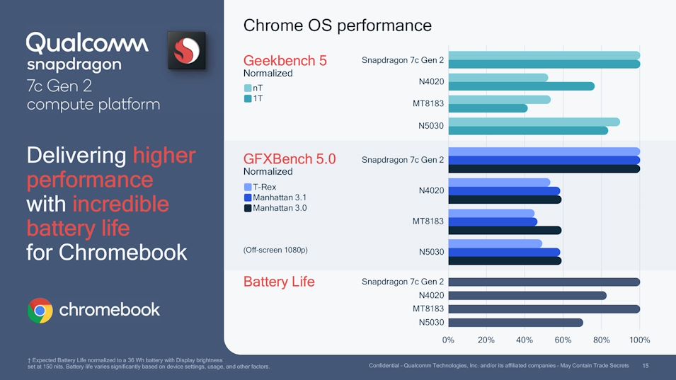 Qualcomm pokazał również dobre wyniki układu Snapdragon 7c Gen 2 w systemie operacyjnym Chrome OS w porównaniu z rywalami, takimi jak Celeron N4020, MediaTek MT8183 i Pentium Silver N5030 w Geekbench 5 i GFXBench 5.0 1080p. Rezultaty zaprezentowane przez Qualcomm oczywiście prezentujemy tutaj.