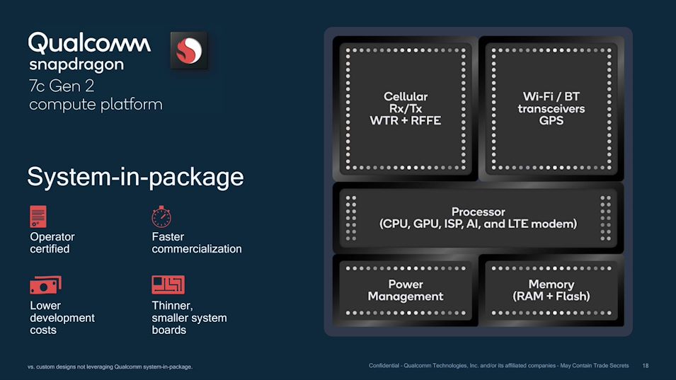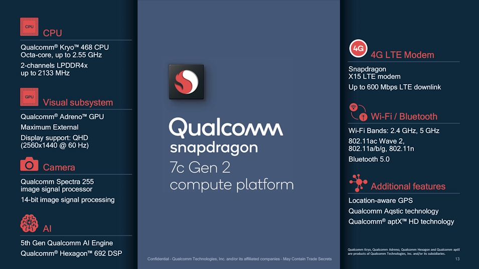 Qualcomm odświeżył swoją platformę Snapdragon 7c przeznaczoną dla najbardziej podstawowych maszyn z systemem Windows 10 ARM i , przede wszystkim, dla Chromebooków. Nowa wersja nosi nazwę Snapdragon 7c Gen 2. Jest to zasadniczo ten sam SoC, co oryginalny 7c, ale z szybszymi rdzeniami Cortex-A76. Qualcomm podał, że Snapdragon 7c Gen 2 może dobrze zaspokoić potrzeby uczniów, pracowników pierwszej linii (np. biura obsługi klienta, punkty sprzedaży) i zwykłych użytkowników, dzięki przyzwoitej wydajności, żywotności baterii i stałej łączności LTE.